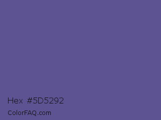 Hex #5d5292 Color is a normal indigo color and the nearest color is Butterfly Bush #624e9a. Hex code #5d5292 and RGB value is rgb(93,82,146). In RGB color space, this color is composed of 36% red, 32% green, 57% blue, In CMYK color space, this color is composed of 36% cyan, 44% magenta, 0% yellow , 43% black , In HSL color space, this color has a hue angle of 250° , 28% saturation and 45% lightness.
