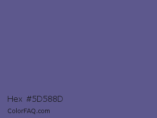 Hex #5d588d Color is a normal indigo color and the nearest color is Butterfly Bush #624e9a. Hex code #5d588d and RGB value is rgb(93,88,141). In RGB color space, this color is composed of 36% red, 35% green, 55% blue, In CMYK color space, this color is composed of 34% cyan, 38% magenta, 0% yellow , 45% black , In HSL color space, this color has a hue angle of 246° , 23% saturation and 45% lightness.
