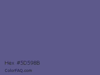 Hex #5d598b Color is a normal indigo color and the nearest color is Butterfly Bush #624e9a. Hex code #5d598b and RGB value is rgb(93,89,139). In RGB color space, this color is composed of 36% red, 35% green, 55% blue, In CMYK color space, this color is composed of 33% cyan, 36% magenta, 0% yellow , 45% black , In HSL color space, this color has a hue angle of 245° , 22% saturation and 45% lightness.
