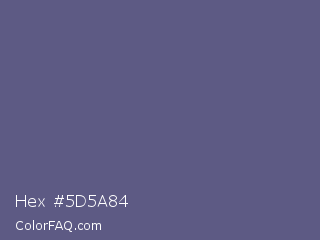 Hex #5d5a84 Color is a normal indigo color and the nearest color is Comet #5c5d75. Hex code #5d5a84 and RGB value is rgb(93,90,132). In RGB color space, this color is composed of 36% red, 35% green, 52% blue, In CMYK color space, this color is composed of 30% cyan, 32% magenta, 0% yellow , 48% black , In HSL color space, this color has a hue angle of 244° , 19% saturation and 44% lightness.