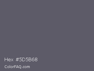Hex #5d5b68 Color is a normal indigo color and the nearest color is Mid Gray #5f5f6e. Hex code #5d5b68 and RGB value is rgb(93,91,104). In RGB color space, this color is composed of 36% red, 36% green, 41% blue, In CMYK color space, this color is composed of 11% cyan, 13% magenta, 0% yellow , 59% black , In HSL color space, this color has a hue angle of 249° , 7% saturation and 38% lightness.
