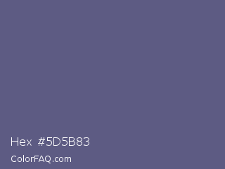 Hex #5d5b83 Color is a normal indigo color and the nearest color is Comet #5c5d75. Hex code #5d5b83 and RGB value is rgb(93,91,131). In RGB color space, this color is composed of 36% red, 36% green, 51% blue, In CMYK color space, this color is composed of 29% cyan, 31% magenta, 0% yellow , 49% black , In HSL color space, this color has a hue angle of 243° , 18% saturation and 44% lightness.