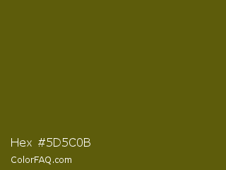 Hex #5d5c0b Color is a very dark yellow color and the nearest color is Saratoga #555b10. Hex code #5d5c0b and RGB value is rgb(93,92,11). In RGB color space, this color is composed of 36% red, 36% green, 4% blue, In CMYK color space, this color is composed of 0% cyan, 1% magenta, 88% yellow , 64% black , In HSL color space, this color has a hue angle of 59° , 79% saturation and 20% lightness.