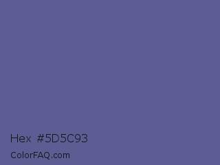Hex #5d5c93 Color is a normal indigo color and the nearest color is Dark Blue Gray #666699. Hex code #5d5c93 and RGB value is rgb(93,92,147). In RGB color space, this color is composed of 36% red, 36% green, 58% blue, In CMYK color space, this color is composed of 37% cyan, 37% magenta, 0% yellow , 42% black , In HSL color space, this color has a hue angle of 241° , 23% saturation and 47% lightness.