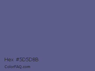 Hex #5d5d8b Color is a normal blue color and the nearest color is UCLA Blue #536895. Hex code #5d5d8b and RGB value is rgb(93,93,139). In RGB color space, this color is composed of 36% red, 36% green, 55% blue, In CMYK color space, this color is composed of 33% cyan, 33% magenta, 0% yellow , 45% black , In HSL color space, this color has a hue angle of 240° , 20% saturation and 45% lightness.