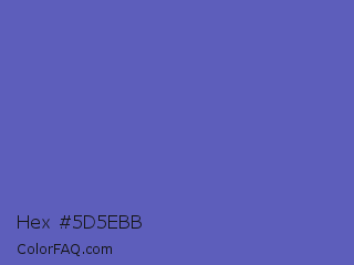 Hex #5d5ebb Color is a normal blue color and the nearest color is Blue Violet #6456b7. Hex code #5d5ebb and RGB value is rgb(93,94,187). In RGB color space, this color is composed of 36% red, 37% green, 73% blue, In CMYK color space, this color is composed of 50% cyan, 50% magenta, 0% yellow , 27% black , In HSL color space, this color has a hue angle of 239° , 41% saturation and 55% lightness.