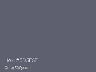 Hex #5d5f6e Color is a normal blue color and the nearest color is Mid Gray #5f5f6e. Hex code #5d5f6e and RGB value is rgb(93,95,110). In RGB color space, this color is composed of 36% red, 37% green, 43% blue, In CMYK color space, this color is composed of 15% cyan, 14% magenta, 0% yellow , 57% black , In HSL color space, this color has a hue angle of 233° , 8% saturation and 40% lightness.