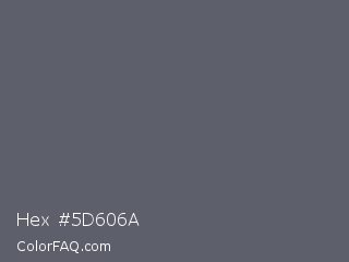 Hex #5d606a Color is a normal blue color and the nearest color is Mid Gray #5f5f6e. Hex code #5d606a and RGB value is rgb(93,96,106). In RGB color space, this color is composed of 36% red, 38% green, 42% blue, In CMYK color space, this color is composed of 12% cyan, 9% magenta, 0% yellow , 58% black , In HSL color space, this color has a hue angle of 226° , 7% saturation and 39% lightness.
