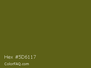 Hex #5d6117 Color is a dark yellow color and the nearest color is Antique Bronze #665d1e. Hex code #5d6117 and RGB value is rgb(93,97,23). In RGB color space, this color is composed of 36% red, 38% green, 9% blue, In CMYK color space, this color is composed of 4% cyan, 0% magenta, 76% yellow , 62% black , In HSL color space, this color has a hue angle of 63° , 62% saturation and 24% lightness.