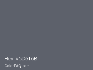 Hex #5d616b Color is a normal blue color and the nearest color is Mid Gray #5f5f6e. Hex code #5d616b and RGB value is rgb(93,97,107). In RGB color space, this color is composed of 36% red, 38% green, 42% blue, In CMYK color space, this color is composed of 13% cyan, 9% magenta, 0% yellow , 58% black , In HSL color space, this color has a hue angle of 223° , 7% saturation and 39% lightness.