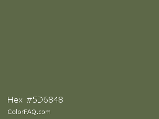 Hex #5d6848 Color is a normal green color and the nearest color is Finch #626649. Hex code #5d6848 and RGB value is rgb(93,104,72). In RGB color space, this color is composed of 36% red, 41% green, 28% blue, In CMYK color space, this color is composed of 11% cyan, 0% magenta, 31% yellow , 59% black , In HSL color space, this color has a hue angle of 81° , 18% saturation and 35% lightness.