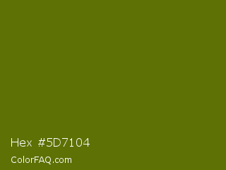 Hex #5d7104 Color is a dark lime color and the nearest color is Avocado #568203. Hex code #5d7104 and RGB value is rgb(93,113,4). In RGB color space, this color is composed of 36% red, 44% green, 2% blue, In CMYK color space, this color is composed of 18% cyan, 0% magenta, 96% yellow , 56% black , In HSL color space, this color has a hue angle of 71° , 93% saturation and 23% lightness.