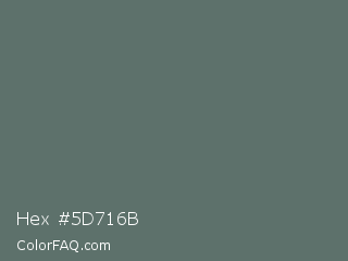 Hex #5d716b Color is a normal green color and the nearest color is Corduroy #606e68. Hex code #5d716b and RGB value is rgb(93,113,107). In RGB color space, this color is composed of 36% red, 44% green, 42% blue, In CMYK color space, this color is composed of 18% cyan, 0% magenta, 5% yellow , 56% black , In HSL color space, this color has a hue angle of 162° , 10% saturation and 40% lightness.