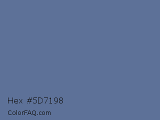 Hex #5d7198 Color is a normal blue color and the nearest color is Waikawa Gray #5a6e9c. Hex code #5d7198 and RGB value is rgb(93,113,152). In RGB color space, this color is composed of 36% red, 44% green, 60% blue, In CMYK color space, this color is composed of 39% cyan, 26% magenta, 0% yellow , 40% black , In HSL color space, this color has a hue angle of 220° , 24% saturation and 48% lightness.