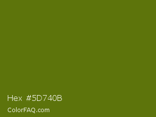 Hex #5d740b Color is a dark lime color and the nearest color is Avocado #568203. Hex code #5d740b and RGB value is rgb(93,116,11). In RGB color space, this color is composed of 36% red, 45% green, 4% blue, In CMYK color space, this color is composed of 20% cyan, 0% magenta, 91% yellow , 55% black , In HSL color space, this color has a hue angle of 73° , 83% saturation and 25% lightness.