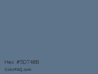 Hex #5d748b Color is a normal blue color and the nearest color is Smalt Blue #51808f. Hex code #5d748b and RGB value is rgb(93,116,139). In RGB color space, this color is composed of 36% red, 45% green, 55% blue, In CMYK color space, this color is composed of 33% cyan, 17% magenta, 0% yellow , 45% black , In HSL color space, this color has a hue angle of 210° , 20% saturation and 45% lightness.