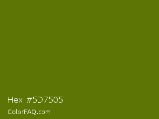 Hex #5d7505 Color is a dark lime color and the nearest color is Avocado #568203. Hex code #5d7505 and RGB value is rgb(93,117,5). In RGB color space, this color is composed of 36% red, 46% green, 2% blue, In CMYK color space, this color is composed of 21% cyan, 0% magenta, 96% yellow , 54% black , In HSL color space, this color has a hue angle of 73° , 92% saturation and 24% lightness.