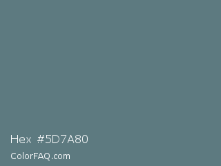 Hex #5d7a80 Color is a normal cyan color and the nearest color is Wintergreen Dream #56887d. Hex code #5d7a80 and RGB value is rgb(93,122,128). In RGB color space, this color is composed of 36% red, 48% green, 50% blue, In CMYK color space, this color is composed of 27% cyan, 5% magenta, 0% yellow , 50% black , In HSL color space, this color has a hue angle of 190° , 16% saturation and 43% lightness.