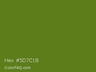 Hex #5d7c1b Color is a dark lime color and the nearest color is Fern Frond #657220. Hex code #5d7c1b and RGB value is rgb(93,124,27). In RGB color space, this color is composed of 36% red, 49% green, 11% blue, In CMYK color space, this color is composed of 25% cyan, 0% magenta, 78% yellow , 51% black , In HSL color space, this color has a hue angle of 79° , 64% saturation and 30% lightness.