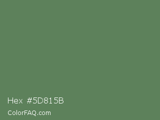 Hex #5d815b Color is a normal green color and the nearest color is Glade Green #61845f. Hex code #5d815b and RGB value is rgb(93,129,91). In RGB color space, this color is composed of 36% red, 51% green, 36% blue, In CMYK color space, this color is composed of 28% cyan, 0% magenta, 29% yellow , 49% black , In HSL color space, this color has a hue angle of 117° , 17% saturation and 43% lightness.