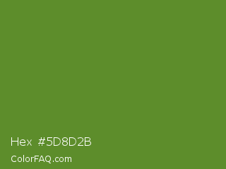 Hex #5d8d2b Color is a normal green color and the nearest color is Maximum Green #5e8c31. Hex code #5d8d2b and RGB value is rgb(93,141,43). In RGB color space, this color is composed of 36% red, 55% green, 17% blue, In CMYK color space, this color is composed of 34% cyan, 0% magenta, 70% yellow , 45% black , In HSL color space, this color has a hue angle of 89° , 53% saturation and 36% lightness.