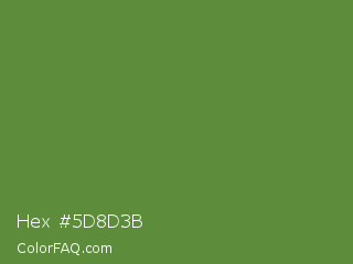 Hex #5d8d3b Color is a normal green color and the nearest color is Maximum Green #5e8c31. Hex code #5d8d3b and RGB value is rgb(93,141,59). In RGB color space, this color is composed of 36% red, 55% green, 23% blue, In CMYK color space, this color is composed of 34% cyan, 0% magenta, 58% yellow , 45% black , In HSL color space, this color has a hue angle of 95° , 41% saturation and 39% lightness.