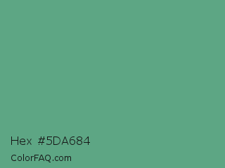 Hex #5da684 Color is a normal green color and the nearest color is Shiny Shamrock #5fa778. Hex code #5da684 and RGB value is rgb(93,166,132). In RGB color space, this color is composed of 36% red, 65% green, 52% blue, In CMYK color space, this color is composed of 44% cyan, 0% magenta, 20% yellow , 35% black , In HSL color space, this color has a hue angle of 152° , 29% saturation and 51% lightness.