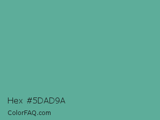 Hex #5dad9a Color is a normal cyan color and the nearest color is Polished Pine #5da493. Hex code #5dad9a and RGB value is rgb(93,173,154). In RGB color space, this color is composed of 36% red, 68% green, 60% blue, In CMYK color space, this color is composed of 46% cyan, 0% magenta, 11% yellow , 32% black , In HSL color space, this color has a hue angle of 166° , 33% saturation and 52% lightness.