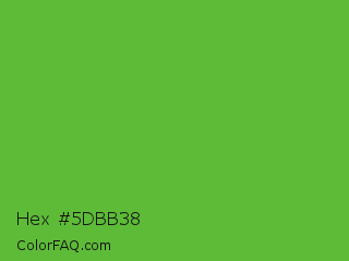 Hex #5dbb38 Color is a normal green color and the nearest color is Green RYB #66b032. Hex code #5dbb38 and RGB value is rgb(93,187,56). In RGB color space, this color is composed of 36% red, 73% green, 22% blue, In CMYK color space, this color is composed of 50% cyan, 0% magenta, 70% yellow , 27% black , In HSL color space, this color has a hue angle of 103° , 54% saturation and 48% lightness.
