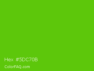 Hex #5dc70b Color is a normal green color and the nearest color is Kelly Green #4cbb17. Hex code #5dc70b and RGB value is rgb(93,199,11). In RGB color space, this color is composed of 36% red, 78% green, 4% blue, In CMYK color space, this color is composed of 53% cyan, 0% magenta, 94% yellow , 22% black , In HSL color space, this color has a hue angle of 94° , 90% saturation and 41% lightness.
