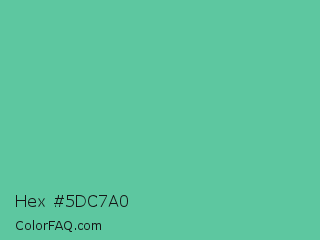 Hex #5dc7a0 Color is a normal green color and the nearest color is Tradewind #5fb3ac. Hex code #5dc7a0 and RGB value is rgb(93,199,160). In RGB color space, this color is composed of 36% red, 78% green, 63% blue, In CMYK color space, this color is composed of 53% cyan, 0% magenta, 20% yellow , 22% black , In HSL color space, this color has a hue angle of 158° , 49% saturation and 57% lightness.