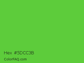 Hex #5dcc3b Color is a normal green color and the nearest color is Green RYB #66b032. Hex code #5dcc3b and RGB value is rgb(93,204,59). In RGB color space, this color is composed of 36% red, 80% green, 23% blue, In CMYK color space, this color is composed of 54% cyan, 0% magenta, 71% yellow , 20% black , In HSL color space, this color has a hue angle of 106° , 59% saturation and 52% lightness.