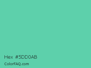 Hex #5dd0ab Color is a normal green color and the nearest color is Medium Aquamarine #66ddaa. Hex code #5dd0ab and RGB value is rgb(93,208,171). In RGB color space, this color is composed of 36% red, 82% green, 67% blue, In CMYK color space, this color is composed of 55% cyan, 0% magenta, 18% yellow , 18% black , In HSL color space, this color has a hue angle of 161° , 55% saturation and 59% lightness.