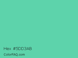 Hex #5dd3ab Color is a normal green color and the nearest color is Medium Aquamarine #66ddaa. Hex code #5dd3ab and RGB value is rgb(93,211,171). In RGB color space, this color is composed of 36% red, 83% green, 67% blue, In CMYK color space, this color is composed of 56% cyan, 0% magenta, 19% yellow , 17% black , In HSL color space, this color has a hue angle of 160° , 57% saturation and 60% lightness.