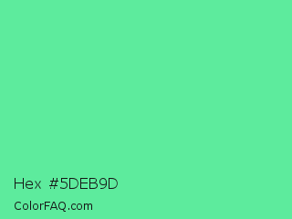 Hex #5deb9d Color is a light green color and the nearest color is Medium Aquamarine #66ddaa. Hex code #5deb9d and RGB value is rgb(93,235,157). In RGB color space, this color is composed of 36% red, 92% green, 62% blue, In CMYK color space, this color is composed of 60% cyan, 0% magenta, 33% yellow , 8% black , In HSL color space, this color has a hue angle of 147° , 78% saturation and 64% lightness.