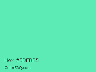Hex #5debb5 Color is a light green color and the nearest color is Medium Aquamarine #66ddaa. Hex code #5debb5 and RGB value is rgb(93,235,181). In RGB color space, this color is composed of 36% red, 92% green, 71% blue, In CMYK color space, this color is composed of 60% cyan, 0% magenta, 23% yellow , 8% black , In HSL color space, this color has a hue angle of 157° , 78% saturation and 64% lightness.