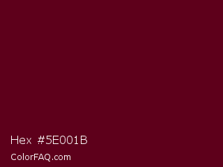 Hex #5e001b Color is a very dark rose color and the nearest color is Bordeaux #5c0120. Hex code #5e001b and RGB value is rgb(94,0,27). In RGB color space, this color is composed of 37% red, 0% green, 11% blue, In CMYK color space, this color is composed of 0% cyan, 100% magenta, 71% yellow , 63% black , In HSL color space, this color has a hue angle of 343° , 100% saturation and 18% lightness.
