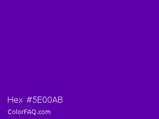 Hex #5e00ab Color is a normal purple color and the nearest color is Purple #660099. Hex code #5e00ab and RGB value is rgb(94,0,171). In RGB color space, this color is composed of 37% red, 0% green, 67% blue, In CMYK color space, this color is composed of 45% cyan, 100% magenta, 0% yellow , 33% black , In HSL color space, this color has a hue angle of 273° , 100% saturation and 34% lightness.