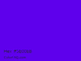 Hex #5e00eb Color is a normal violet color and the nearest color is Electric Indigo #6f00ff. Hex code #5e00eb and RGB value is rgb(94,0,235). In RGB color space, this color is composed of 37% red, 0% green, 92% blue, In CMYK color space, this color is composed of 60% cyan, 100% magenta, 0% yellow , 8% black , In HSL color space, this color has a hue angle of 264° , 100% saturation and 46% lightness.