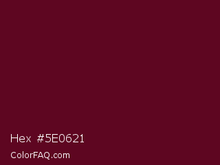 Hex #5e0621 Color is a very dark rose color and the nearest color is Bordeaux #5c0120. Hex code #5e0621 and RGB value is rgb(94,6,33). In RGB color space, this color is composed of 37% red, 2% green, 13% blue, In CMYK color space, this color is composed of 0% cyan, 94% magenta, 65% yellow , 63% black , In HSL color space, this color has a hue angle of 342° , 88% saturation and 20% lightness.