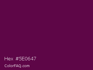 Hex #5e0647 Color is a very dark magenta color and the nearest color is Pompadour #660045. Hex code #5e0647 and RGB value is rgb(94,6,71). In RGB color space, this color is composed of 37% red, 2% green, 28% blue, In CMYK color space, this color is composed of 0% cyan, 94% magenta, 24% yellow , 63% black , In HSL color space, this color has a hue angle of 316° , 88% saturation and 20% lightness.