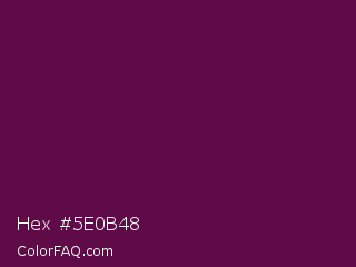 Hex #5e0b48 Color is a very dark magenta color and the nearest color is Pompadour #660045. Hex code #5e0b48 and RGB value is rgb(94,11,72). In RGB color space, this color is composed of 37% red, 4% green, 28% blue, In CMYK color space, this color is composed of 0% cyan, 88% magenta, 23% yellow , 63% black , In HSL color space, this color has a hue angle of 316° , 79% saturation and 21% lightness.