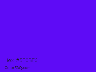 Hex #5e0bf6 Color is a normal violet color and the nearest color is Han Purple #5218fa. Hex code #5e0bf6 and RGB value is rgb(94,11,246). In RGB color space, this color is composed of 37% red, 4% green, 96% blue, In CMYK color space, this color is composed of 62% cyan, 96% magenta, 0% yellow , 4% black , In HSL color space, this color has a hue angle of 261° , 93% saturation and 50% lightness.