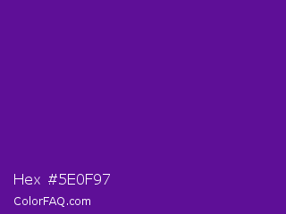 Hex #5e0f97 Color is a normal purple color and the nearest color is Purple #660099. Hex code #5e0f97 and RGB value is rgb(94,15,151). In RGB color space, this color is composed of 37% red, 6% green, 59% blue, In CMYK color space, this color is composed of 38% cyan, 90% magenta, 0% yellow , 41% black , In HSL color space, this color has a hue angle of 275° , 82% saturation and 33% lightness.