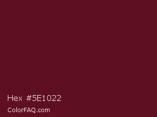 Hex #5e1022 Color is a very dark red color and the nearest color is Bordeaux #5c0120. Hex code #5e1022 and RGB value is rgb(94,16,34). In RGB color space, this color is composed of 37% red, 6% green, 13% blue, In CMYK color space, this color is composed of 0% cyan, 83% magenta, 64% yellow , 63% black , In HSL color space, this color has a hue angle of 346° , 71% saturation and 22% lightness.