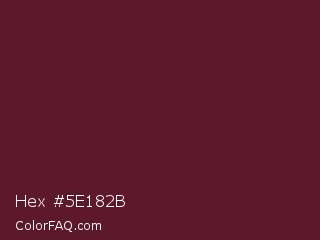 Hex #5e182b Color is a dark rose color and the nearest color is Wine Berry #591d35. Hex code #5e182b and RGB value is rgb(94,24,43). In RGB color space, this color is composed of 37% red, 9% green, 17% blue, In CMYK color space, this color is composed of 0% cyan, 74% magenta, 54% yellow , 63% black , In HSL color space, this color has a hue angle of 344° , 59% saturation and 23% lightness.