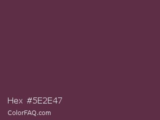 Hex #5e2e47 Color is a dark rose color and the nearest color is Wine Dregs #673147. Hex code #5e2e47 and RGB value is rgb(94,46,71). In RGB color space, this color is composed of 37% red, 18% green, 28% blue, In CMYK color space, this color is composed of 0% cyan, 51% magenta, 24% yellow , 63% black , In HSL color space, this color has a hue angle of 329° , 34% saturation and 27% lightness.