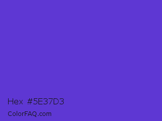Hex #5e37d3 Color is a normal indigo color and the nearest color is Purple Heart Crayola #652dc1. Hex code #5e37d3 and RGB value is rgb(94,55,211). In RGB color space, this color is composed of 37% red, 22% green, 83% blue, In CMYK color space, this color is composed of 55% cyan, 74% magenta, 0% yellow , 17% black , In HSL color space, this color has a hue angle of 255° , 64% saturation and 52% lightness.