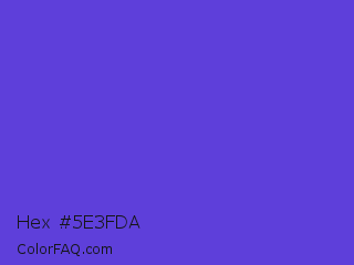 Hex #5e3fda Color is a normal indigo color and the nearest color is Majorelle Blue #6050dc. Hex code #5e3fda and RGB value is rgb(94,63,218). In RGB color space, this color is composed of 37% red, 25% green, 85% blue, In CMYK color space, this color is composed of 57% cyan, 71% magenta, 0% yellow , 15% black , In HSL color space, this color has a hue angle of 252° , 68% saturation and 55% lightness.