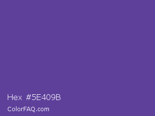 Hex #5e409b Color is a normal indigo color and the nearest color is Royal Purple #6b3fa0. Hex code #5e409b and RGB value is rgb(94,64,155). In RGB color space, this color is composed of 37% red, 25% green, 61% blue, In CMYK color space, this color is composed of 39% cyan, 59% magenta, 0% yellow , 39% black , In HSL color space, this color has a hue angle of 260° , 42% saturation and 43% lightness.